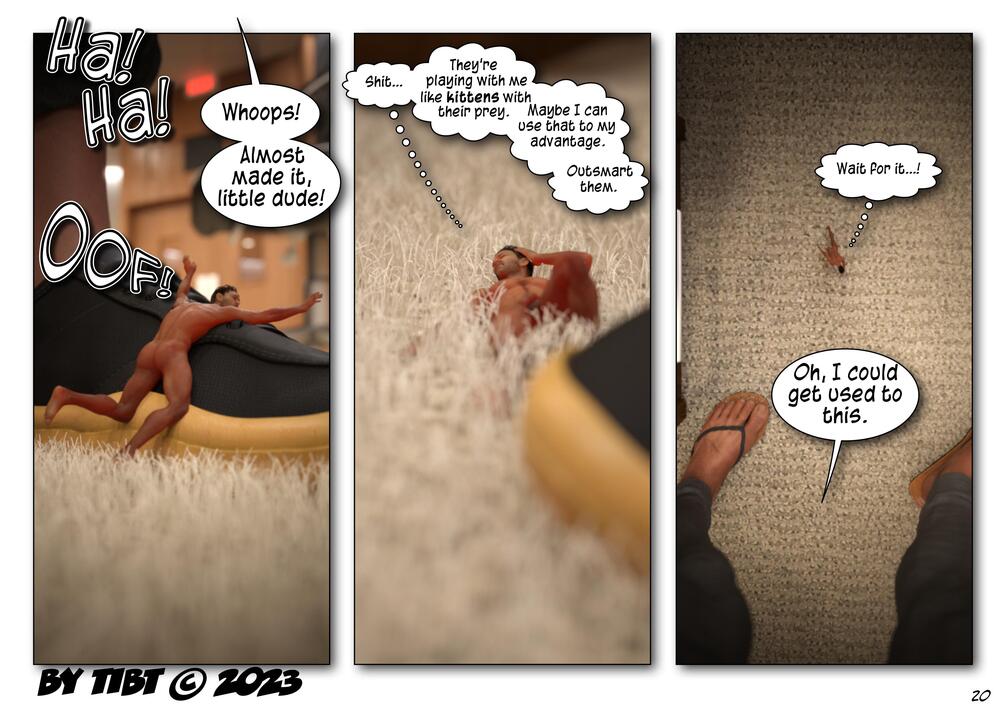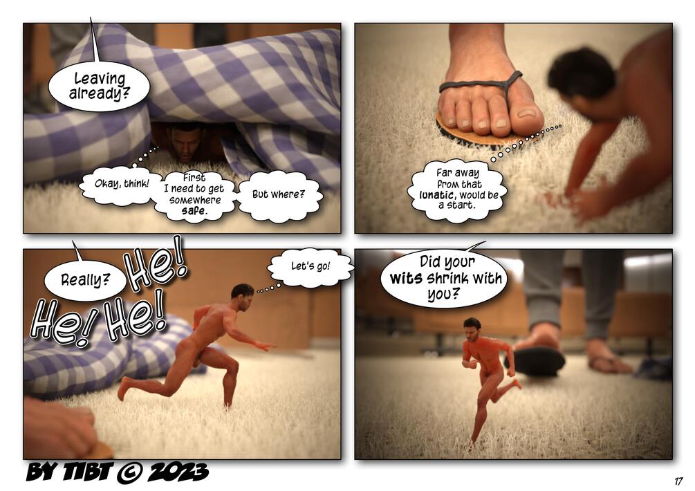 shrinking, plausible size difference, nonconsensual, handplay, footplay, bondage, humiliation, profanity, gentle interaction, nudity, sex.